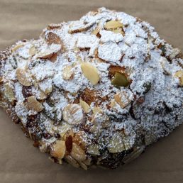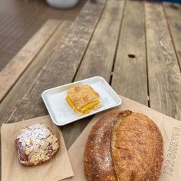 Craving a quality croissant and thought of visiting The Flora Bakehouse again. I decided to drive from the Eastside to Beacon Hill because one should not be deterred by I-520 bridge being closed all weekend or traffic jams today. Gotta be honest that parking or potential sellout of favorites can be stressful any day at this bakery. I had an extra driver with me in case I couldn't find any street parking within a block and have to wait in the long line. At 10:30 am, the line was 4 people deep, the cases looked fairly stocked, and they had the 2 main croissant items I had been thinking about. Service was friendly inspite of a busy morning. My box of bakes included: Redmond pepper and cheddar scone: buttery, slightly savory, a tad dry and sweet. Wished there was more cheese in dough and salt? 3/5 Sea salt chocolate croissants: buttery, fluffy, flaky, enhanced by 2 small batons of dark chocolate, light sprinkling of sea salt. 4/5 Morning bun: plain looking danish-style bun had a light aroma of orange zest, rolled in sugar. Kinda dry 3/5 Twice baked almond croissants: it's everything you'd expect a top notch almond croissant to be and not too sweet. They didn't skimp on the almond paste filling and almonds on top. 5/5 This is an essential item for every visit. I don't need to go to Canada for my cravings. -Will try other seasonal items and din-in to experience rooftop patio. -Pricing is fair for real butter and high- end quality bakes.